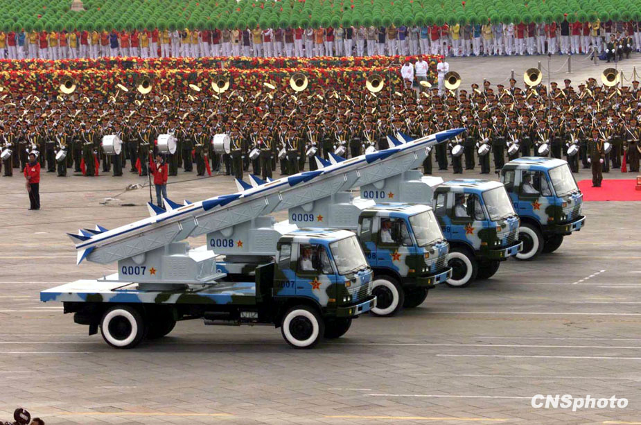 圖為1999年國慶閱兵式上海軍導(dǎo)彈方隊從天安門前走過。 中新社發(fā) 李剛 攝