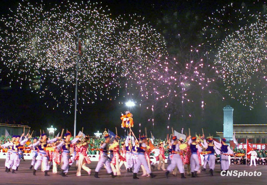 圖為1999年首都國慶聯(lián)歡晚會,禮花繽紛,場面熱鬧。中新社發(fā) 宗金柱 攝