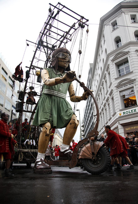 10月2日,來自法國一家戲劇公司的兩個巨型提線木偶亮相柏林街頭,它們將在露天劇場進行表演,以此紀念柏林墻推倒20周年。圖片來源:中國新聞網