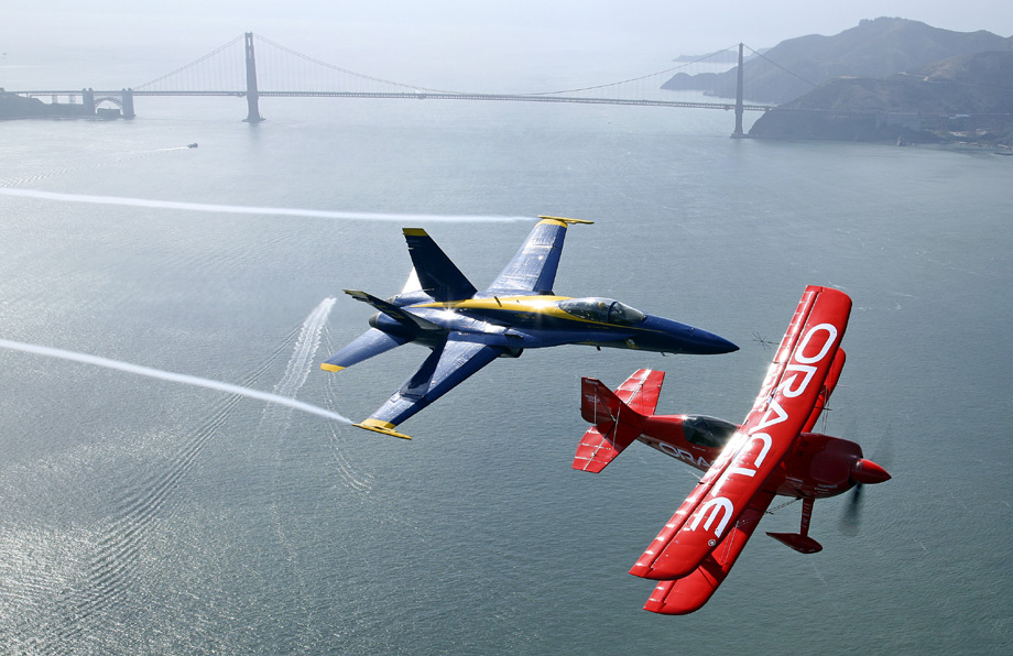2009年10月8日,美軍飛機(jī)在舊金山灣上空進(jìn)行飛行演練。一年一度的舊金山艦隊(duì)周將于10月10日開幕,屆時會有船艦游行和飛行表演等活動。 來源:中國新聞網(wǎng)