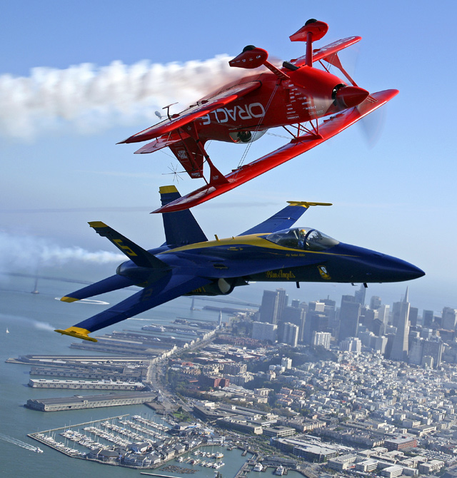 2009年10月8日,美軍飛機在舊金山灣上空進行飛行演練。一年一度的舊金山艦隊周將于10月10日開幕,屆時會有船艦游行和飛行表演等活動。 來源:中國新聞網(wǎng)