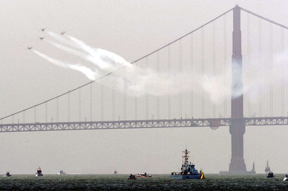 2009年10月8日,美軍飛機(jī)在舊金山灣上空進(jìn)行飛行演練。一年一度的舊金山艦隊(duì)周將于10月10日開(kāi)幕,屆時(shí)會(huì)有船艦游行和飛行表演等活動(dòng)。 來(lái)源:中國(guó)新聞網(wǎng)