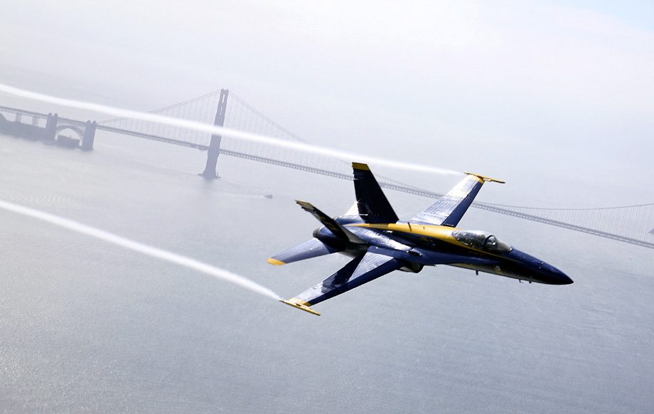 2009年10月8日,美軍飛機在舊金山灣上空進行飛行演練。一年一度的舊金山艦隊周將于10月10日開幕,屆時會有船艦游行和飛行表演等活動。 來源:中國新聞網(wǎng)