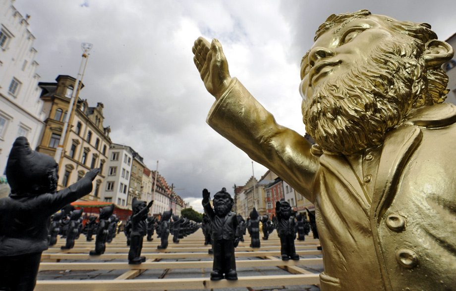 10月14日,德國施特勞賓市街頭擺放了1250個行納粹禮的花園土地神像,“行納粹禮的花園土地神”其實是一款雕塑作品,是由59歲的德國藝術家奧特馬爾·赫勒爾創(chuàng)作的目的在于提醒人們警惕法西斯思想,反對使用法西斯思想控制大眾。