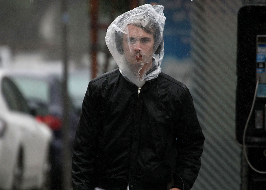 周二(10月13日),美國(guó)舊金山街頭一位行人用塑料袋套在頭上,抵擋暴雨。圖片來源:中國(guó)新聞網(wǎng)