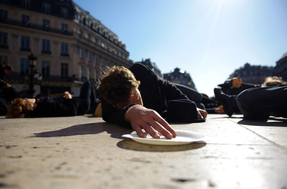 周四(10月15日),示威者身穿黑色衣服、手持空盤子在巴黎歌劇院前抗議。他們此舉是為了呼吁人們關(guān)注世界上的饑民!10月16日是世界糧食日,今年的主題是“應(yīng)對危機,實現(xiàn)糧食安全”。 圖片來源:中國新聞網(wǎng)
