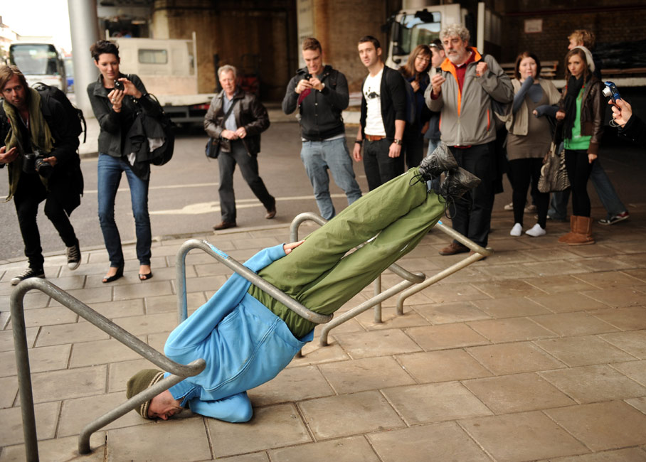 10月16日,來(lái)自?shī)W地利的藝術(shù)家威利·多勒帶著他的城市空間人體藝術(shù)團(tuán)隊(duì),在倫敦街頭進(jìn)行藝術(shù)表演。幾十位表演者把自己的身體擠進(jìn)通道入口、壁凹和任何能找得到的公共建筑的縫隙內(nèi),供人們欣賞。