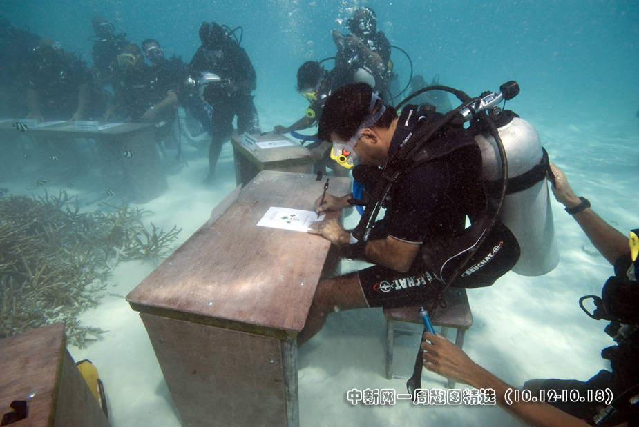 10月17日,印度洋島國馬爾代夫首次在水下召開內(nèi)閣會議。圖片來源:中國新聞網(wǎng)