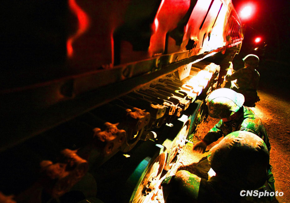 當(dāng)晚國防大學(xué)防務(wù)學(xué)院、空軍指揮學(xué)院的外軍學(xué)員,以及英國、以色列、土耳其、巴基斯坦等國軍事觀察員親臨現(xiàn)場(chǎng)觀摩了后勤保障戰(zhàn)斗準(zhǔn)備、自行榴彈炮占領(lǐng)陣地、裝甲車輛“摸黑”開進(jìn)等戰(zhàn)斗要素。圖為后勤保障基地?fù)屝扪b甲戰(zhàn)車。中新社發(fā) 宋吉河 攝