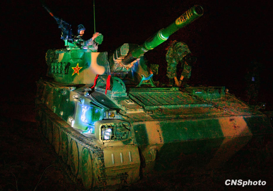 當晚國防大學(xué)防務(wù)學(xué)院、空軍指揮學(xué)院的外軍學(xué)員,以及英國、以色列、土耳其、巴基斯坦等國軍事觀察員親臨現(xiàn)場觀摩了后勤保障戰(zhàn)斗準備、自行榴彈炮占領(lǐng)陣地、裝甲車輛“摸黑”開進等戰(zhàn)斗要素。圖為“摸黑”進入陣地的主戰(zhàn)坦克。中新社發(fā) 宋吉河 攝