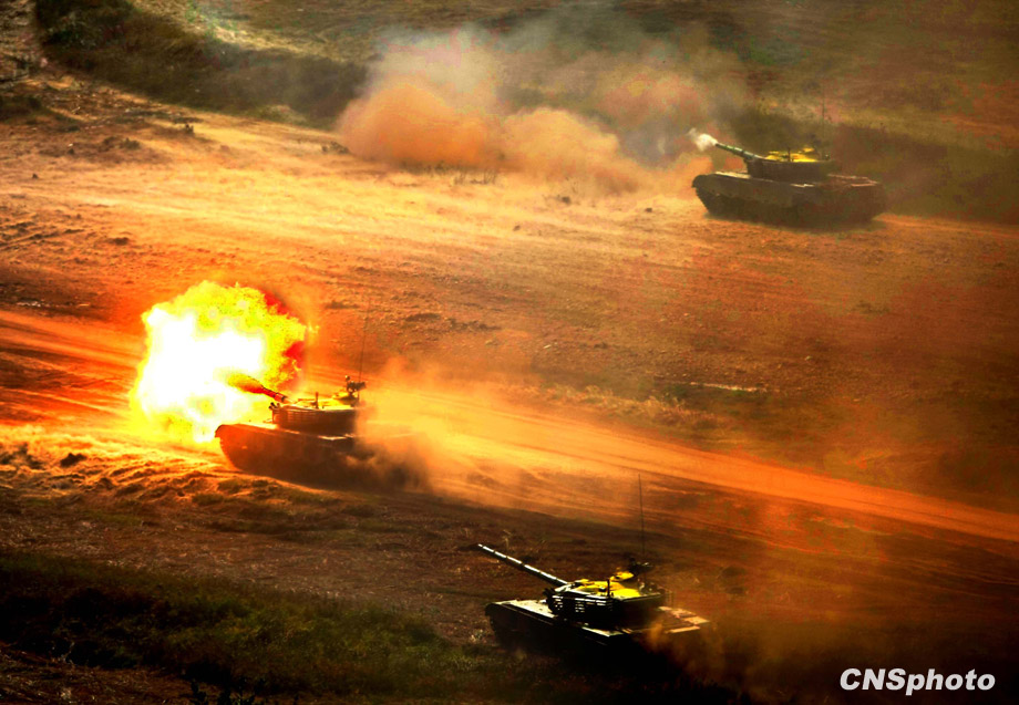 解放軍“前鋒-二00九A”演習,二十二日在濟南軍區(qū)某合同戰(zhàn)術訓練基地進行陸空聯(lián)合火力打擊實兵實彈演練。中新社發(fā) 宋吉河 攝
