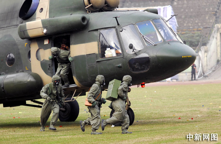 首先趕到現(xiàn)場的是一架米—171直升機,4名防化偵察員全身防護狀態(tài)下依次著陸。著陸后,其中2人實施先期偵察,簡單了解情況后對商場外空氣、進出道路及商場外部設施進行偵察,初步查明遭襲情況,并采集收取樣品;另外2人指導公眾防護并協(xié)助組織撤離危害區(qū)。 郝飛 攝