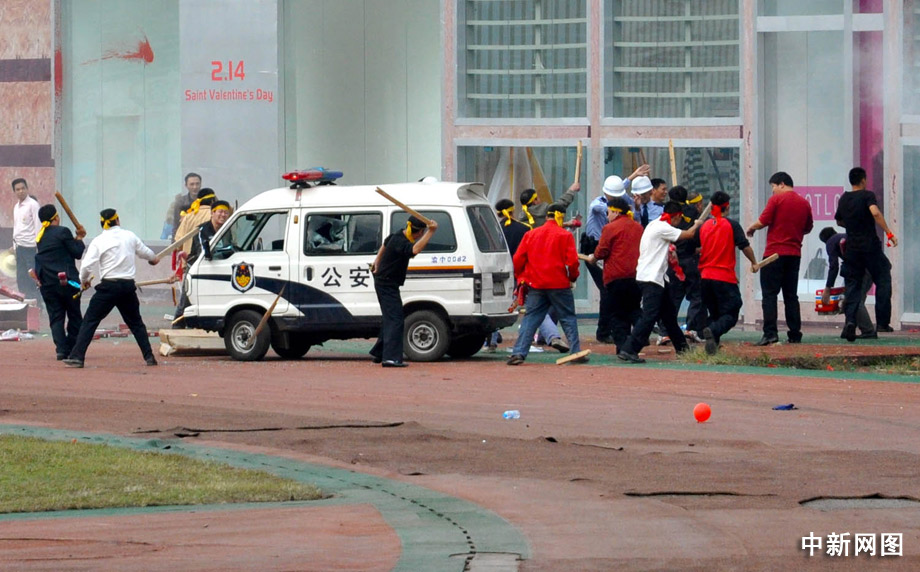 陸續(xù)涌來的“暴徒”,帶來了鐵棍、長刀、鐵鏈等兇器,并結伙圍打執(zhí)勤民警,出現(xiàn)摔、砸商業(yè)設施和投擲礦泉水瓶等行為,在廣場上出現(xiàn)了反動標語,“暴徒”不斷叫囂反動語言,引發(fā)附近眾多群眾圍觀,鬧事人群已達200余人。曹多然 攝