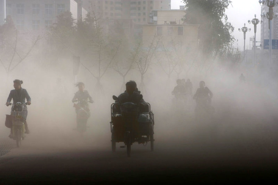 周日(18日), 河北石家莊,中華大街與裕華路交口,自行車在大風(fēng)引起的揚塵中艱難前行。10月18日起,北方迎來大幅降溫,部分地區(qū)風(fēng)力將達(dá)8級。 阿拉爾 攝