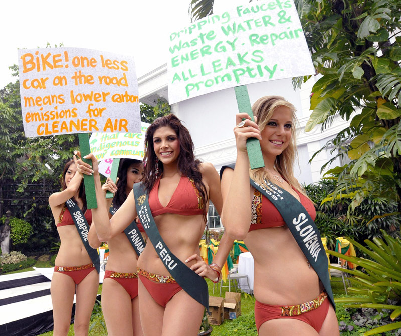 2009世界綠色環(huán)保大使小姐決賽在菲律賓進(jìn)行,來自世界各地的90名佳麗參與角逐。世界綠色環(huán)保大使(地球小姐)評選,是全世界唯一以“綠色環(huán)!睘橹黝}注冊的國際頂級權(quán)威大賽,由菲律賓總統(tǒng)阿羅約創(chuàng)始。圖片來源:中國新聞網(wǎng)
