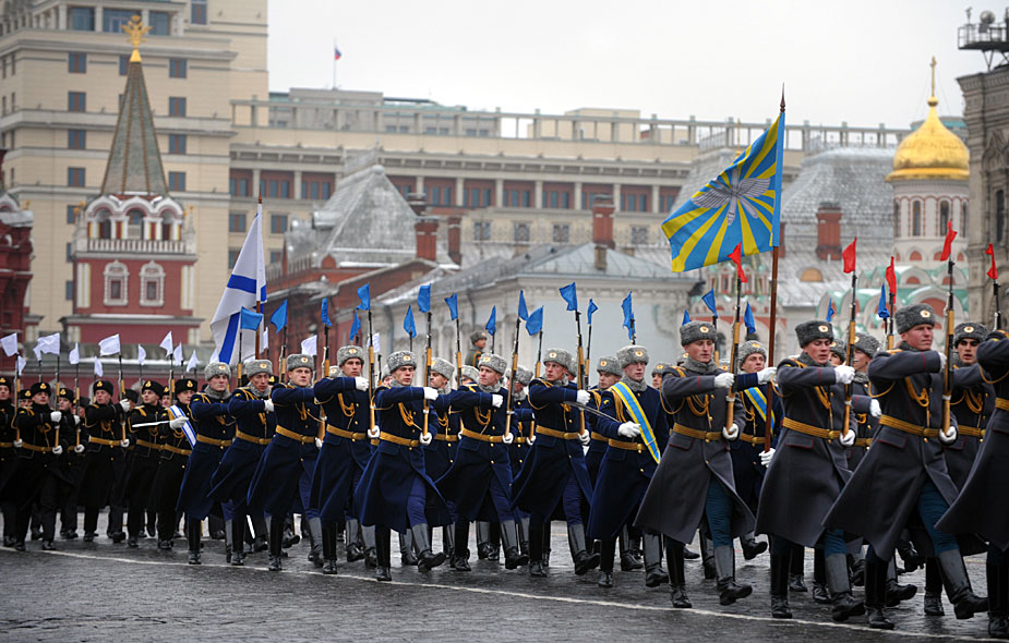 11月7日,俄羅斯士兵身穿二戰(zhàn)時(shí)期的軍服在莫斯科紅場(chǎng)舉行閱兵閱兵式紀(jì)念1941年紅場(chǎng)閱兵。圖片來(lái)源:中國(guó)新聞網(wǎng)