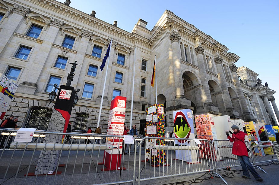 周五(6日),為了紀(jì)念柏林墻倒塌20周年,德國(guó)柏林的勃蘭登堡門(mén)附近擺放了一排墻體模型。來(lái)源:中國(guó)新聞網(wǎng)
