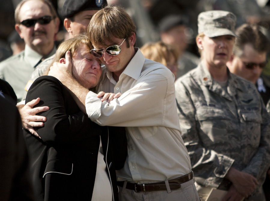 2009年11月10日,在美國(guó)得克薩斯州胡德堡陸軍基地,槍擊案遇害士兵的親屬參加悼念儀式。當(dāng)日,美國(guó)德克薩斯州胡德堡陸軍基地舉行儀式悼念槍擊案遇難者。 圖片來(lái)源:中國(guó)新聞網(wǎng)