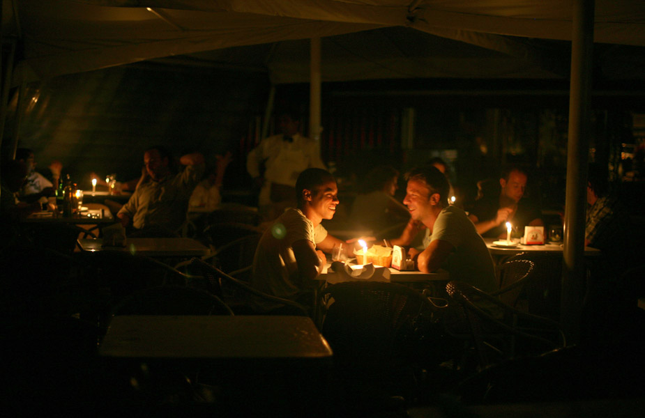當?shù)貢r間10日晚,巴西一座大型水電站發(fā)生事故,造成多個主要城市停電,其中包括圣保羅和里約熱內盧這兩個最大的城市。此次停電范圍巨大,受影響的除了上述的兩個州外,還包括米納斯吉拉斯州、圣埃斯皮里圖州、南馬托格羅索州、戈亞斯州和巴西利亞地區(qū)。圖為在餐館用餐的人們只能借助蠟燭的亮光。