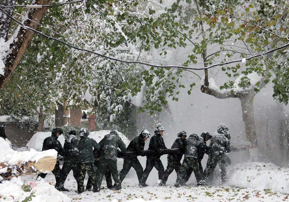 11月11日,石家莊,部隊(duì)官兵采用木棍撞擊樹上積壓的雪。