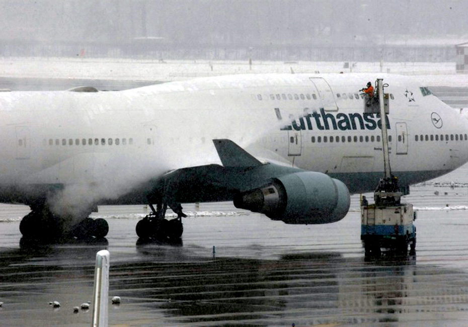 11月12日,由于雪天霧大機(jī)場(chǎng)好多航班延誤或取消,機(jī)場(chǎng)工作人員了為了保證游客出行的順暢,一大早就為停在停機(jī)坪待飛的飛機(jī)作融雪處理。