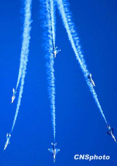 慶祝中國人民解放軍空軍成立60周年飛行表演,11月15日上午在北京沙河機(jī)場(chǎng)舉行。表演按八一飛行表演隊(duì)4架殲-10飛機(jī)表演12個(gè)動(dòng)作和6架殲-7GB飛機(jī)表演15個(gè)動(dòng)作,分四機(jī)對(duì)頭交叉、四機(jī)菱形隊(duì)大坡度盤旋、單機(jī)小速度平飛等27個(gè)動(dòng)作,其中四機(jī)對(duì)頭交叉動(dòng)作是這次表演中技術(shù)難度較大的動(dòng)作之一,這是國產(chǎn)三代飛機(jī)和國產(chǎn)二代飛機(jī)首次同場(chǎng)競(jìng)技表演。圖為殲-7GB表演六機(jī)向下開花。中新社發(fā) 宋吉河 攝