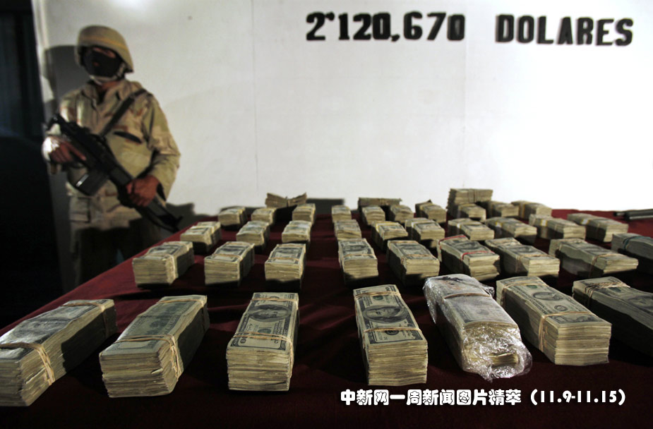 12日(周四),墨西哥軍方展示繳獲的贓款。圖片來源:中國新聞網(wǎng)