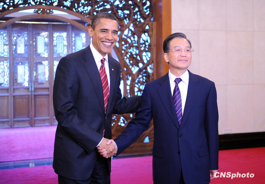 11月18日上午,中國國務(wù)院總理溫家寶在北京釣魚臺國賓館會見了美國總統(tǒng)奧巴馬一行。中新社發(fā) 廖攀 攝