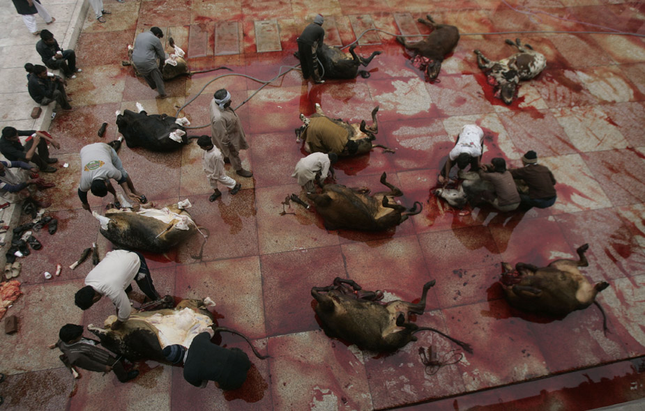 11月28日,世界各國(guó)的穆斯林迎來(lái)傳統(tǒng)節(jié)日“宰牲節(jié)”。圖為巴基斯坦的穆斯林在宰牲節(jié)上宰殺牲畜。