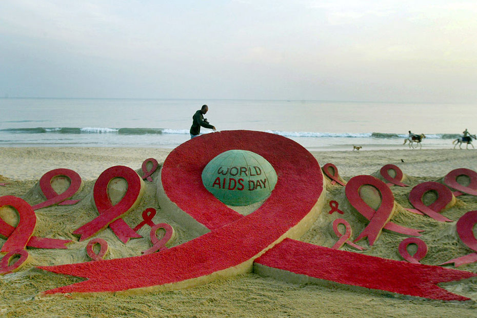 11月30日,印度邦布里,一名藝術家為世界艾滋病日在海灘上制作了紅絲帶主題沙雕。12月1日是世界艾滋病日,2009年世界艾滋病日的主題是“普遍可及和人權(quán)”。世界各地民眾組織各種活動呼吁人們關注艾滋病。圖片來源:中國新聞網(wǎng)