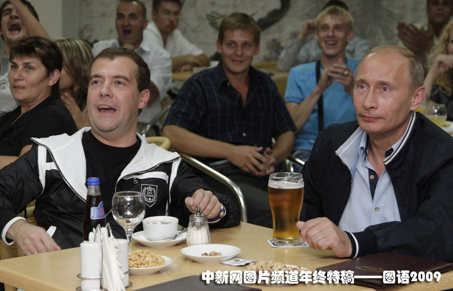 兄弟同樂:2009年8月12日,俄羅斯總統(tǒng)梅德韋杰夫、總理普京在一家咖啡廳里觀看了俄羅斯與阿根廷足球友誼賽的電視直播。