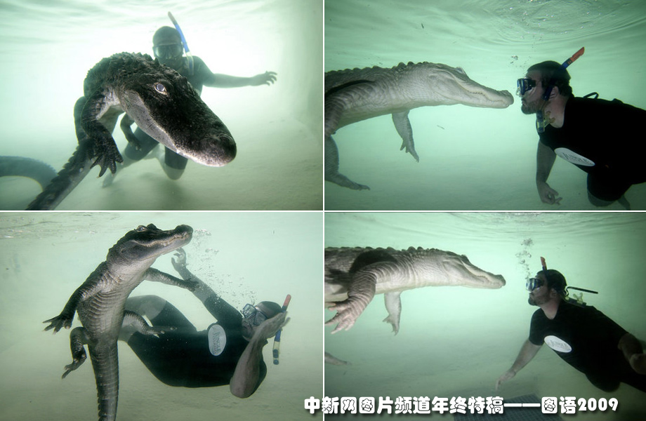 在美國佛州叢林島動物主題公園,男子與一條美洲鱷在水下上演“人鱷共舞”。