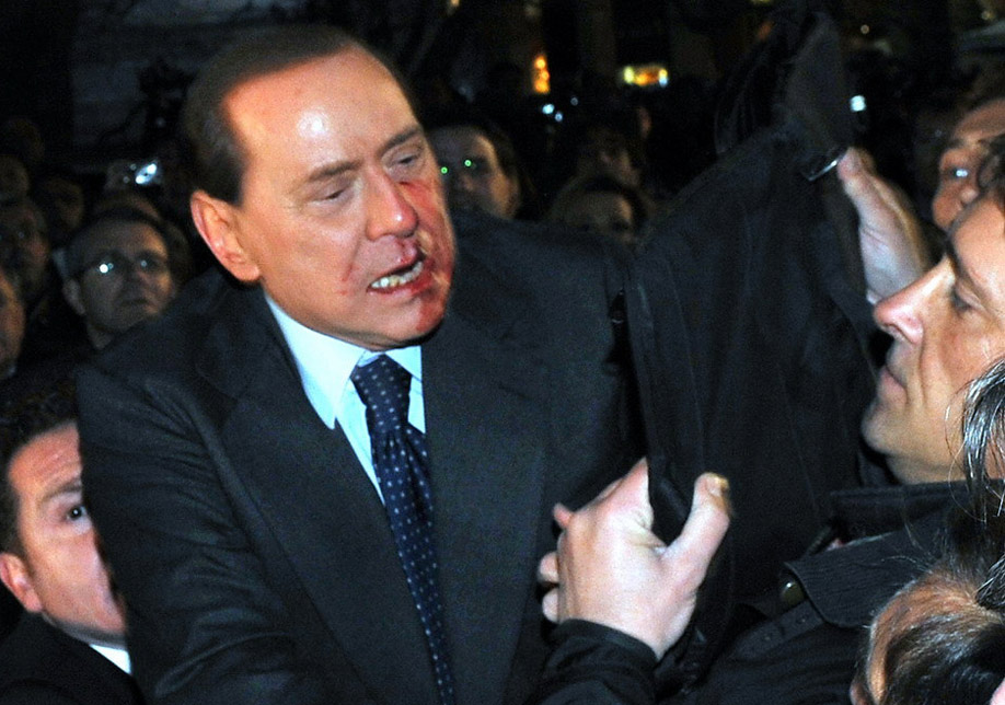 時(shí)值政治盟友沖刺階段,貝盧斯科尼照例參加自己黨派的集會(huì)。就在他給支持者簽名時(shí),人群中一名中年男子突然毆打其面部。當(dāng)?shù)仉娨暸_(tái)畫(huà)面顯示,跌倒在地的貝盧斯科尼被助手扶起時(shí),口鼻出血,面部淤青,表情痛苦。