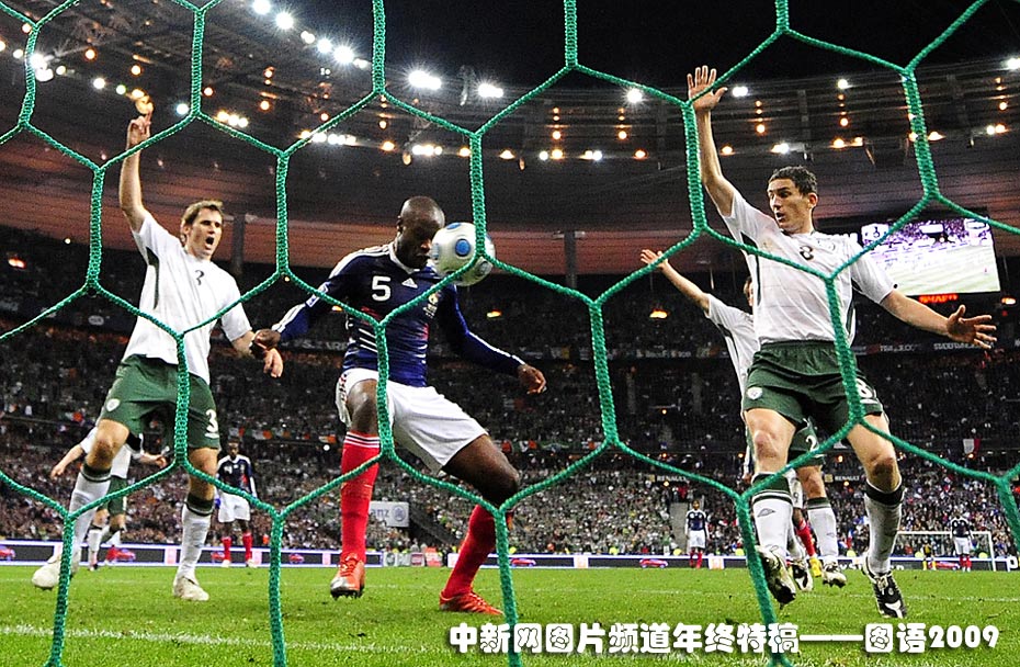 2010年南非世界杯預(yù)選賽法國對愛爾蘭第二回合的比賽周三在法國圣德尼舉行,在加時賽中,法國隊球員關(guān)鍵時刻的一記“手球”逃過裁判的眼睛,幫助后衛(wèi)威廉·加拉成功破網(wǎng),兩隊打成1:1平局,法國隊淘汰愛爾蘭第四次晉級世界杯決賽。圖為,在加拉射門時,愛爾蘭隊隊員舉手示意有犯規(guī)動作。