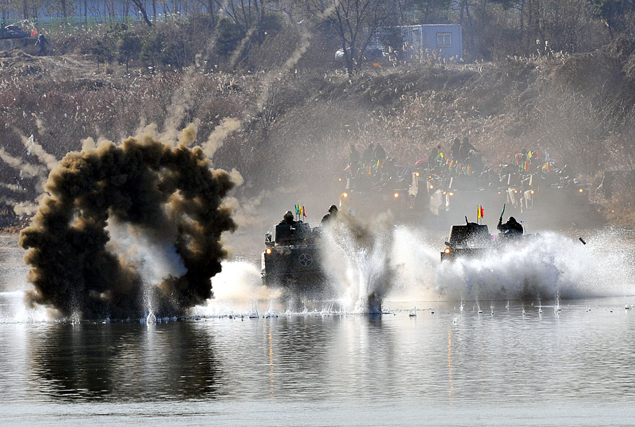 12月16日,韓國第20師團機械化部隊在京畿道驪州南漢江一帶進行大規(guī)模渡河實戰(zhàn)訓(xùn)練。該訓(xùn)練以培養(yǎng)戰(zhàn)斗執(zhí)行能力為重點。圖片來源:中國新聞網(wǎng)