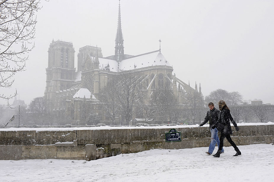 12月17日,法國(guó)巴黎圣母院大教堂前的雪中行人。
