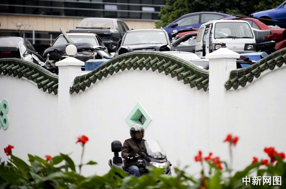 一輛摩托車駛過澳門一家報廢汽車回收場。中新社記者 廖攀 攝
