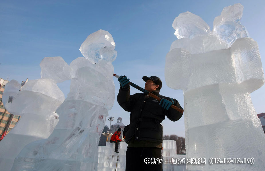 12月16日,新疆烏魯木齊市人民廣場,兩位冰雕師傅正在抓緊時間雕刻一組表現(xiàn)新疆少數(shù)民族風(fēng)情的大型冰雕作品。圖片來源:中國新聞網(wǎng)>>點擊觀看詳細內(nèi)容