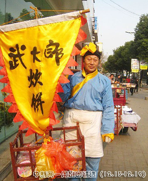 12月18日,46歲的山東省陽谷縣李振生,身著青衣襟、白圍裙、黃頭巾,肩挑貨擔(dān)裝扮成武大郎的模樣在南京街頭走街串巷賣炊餅。圖片來源:中國新聞網(wǎng)>>點擊觀看詳細(xì)內(nèi)容