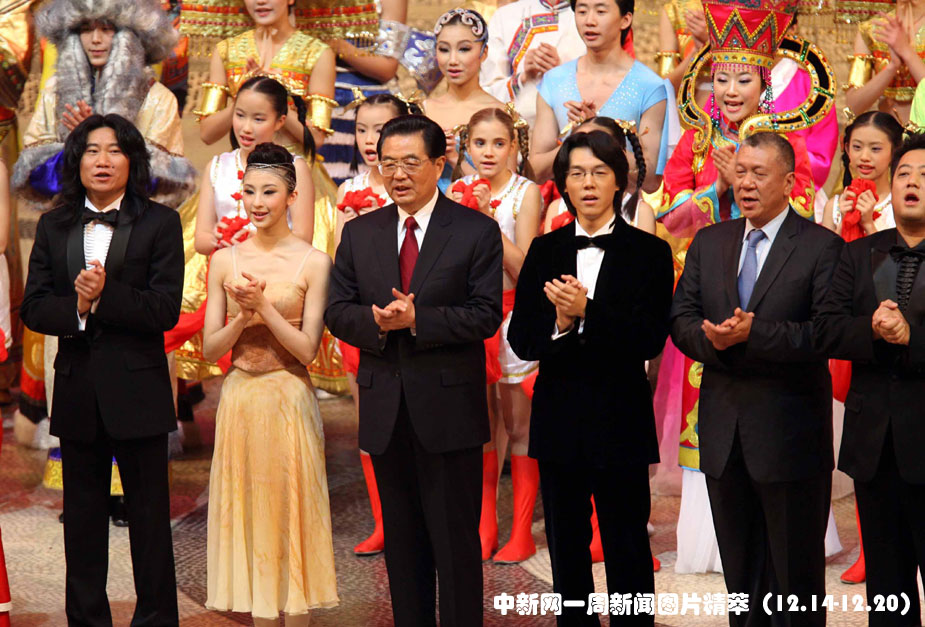 19日(周六)晚間,澳門(mén)特區(qū)舉行盛大文藝晚會(huì),慶祝澳門(mén)回歸祖國(guó)十周年。國(guó)家主席胡錦濤與演員一起唱響《歌唱祖國(guó)》。圖片來(lái)源:中國(guó)新聞網(wǎng)