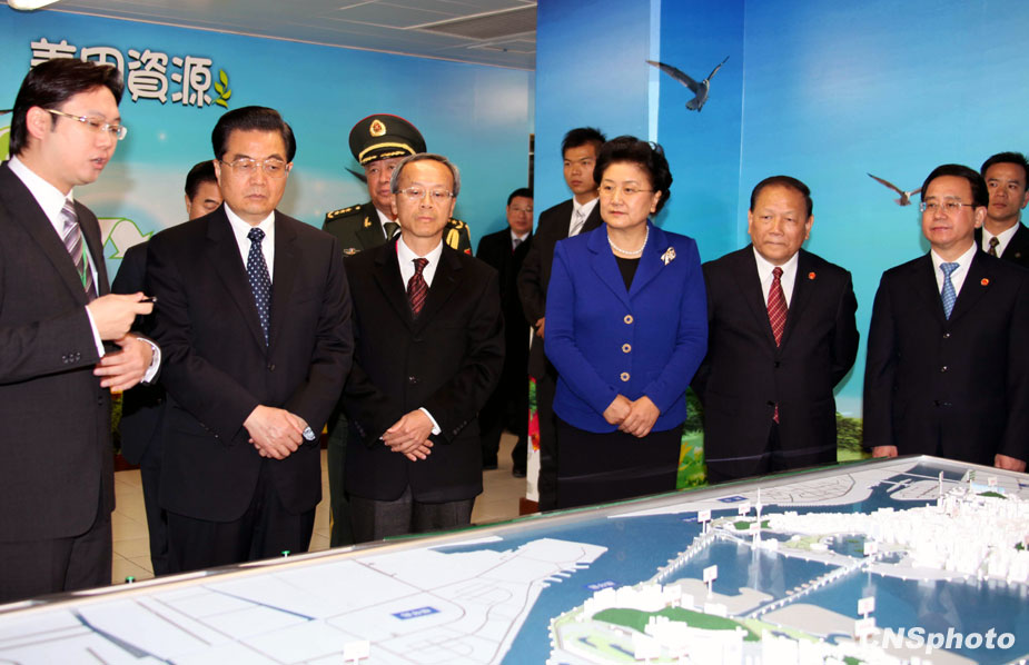 在訪問澳門的緊密行程中,中國國家主席胡錦濤十九日下午來到位于氹仔北安工業(yè)區(qū)的家居棄置物處理中心。胡錦濤聽取了澳門環(huán);ㄔO(shè)施沙盤及展示板介紹并參觀了控制室。中新社發(fā) 張朔 攝