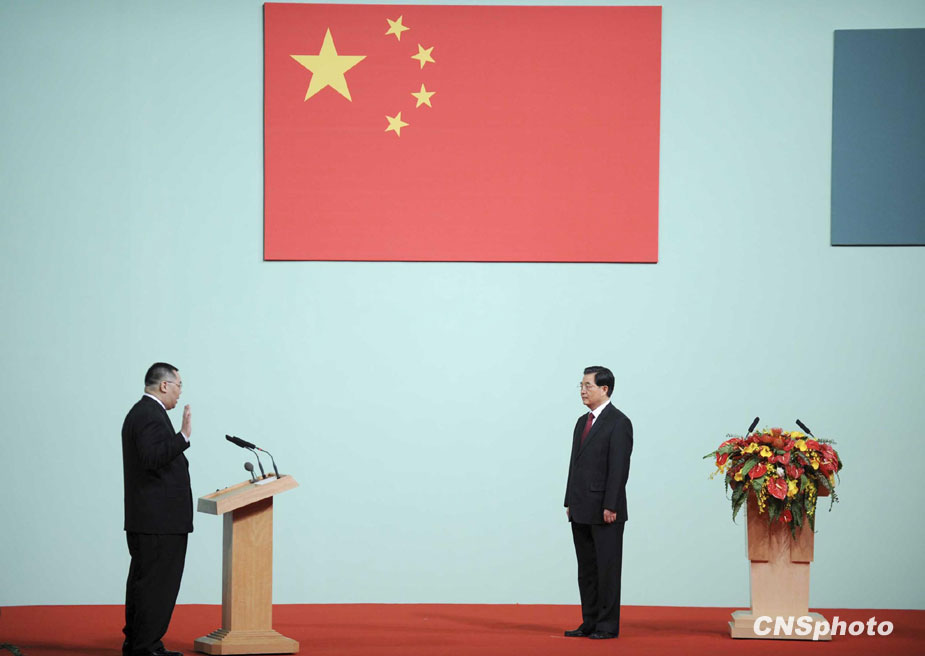 12月20日,慶祝澳門回歸祖國十周年大會暨澳門特別行政區(qū)第三屆政府就職典禮在澳門東亞運動會體育館舉行。澳門特區(qū)第三任行政長官崔世安宣誓就職,國家主席胡錦濤監(jiān)誓。中新社記者 廖攀 攝