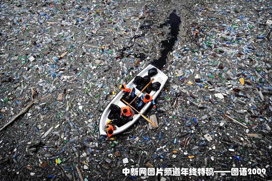 2009年4月25日,保加利亞志愿者們正在努力清理已經(jīng)快要堵塞的瓦哈大壩,那里到處都是的塑料瓶還有其他垃圾。