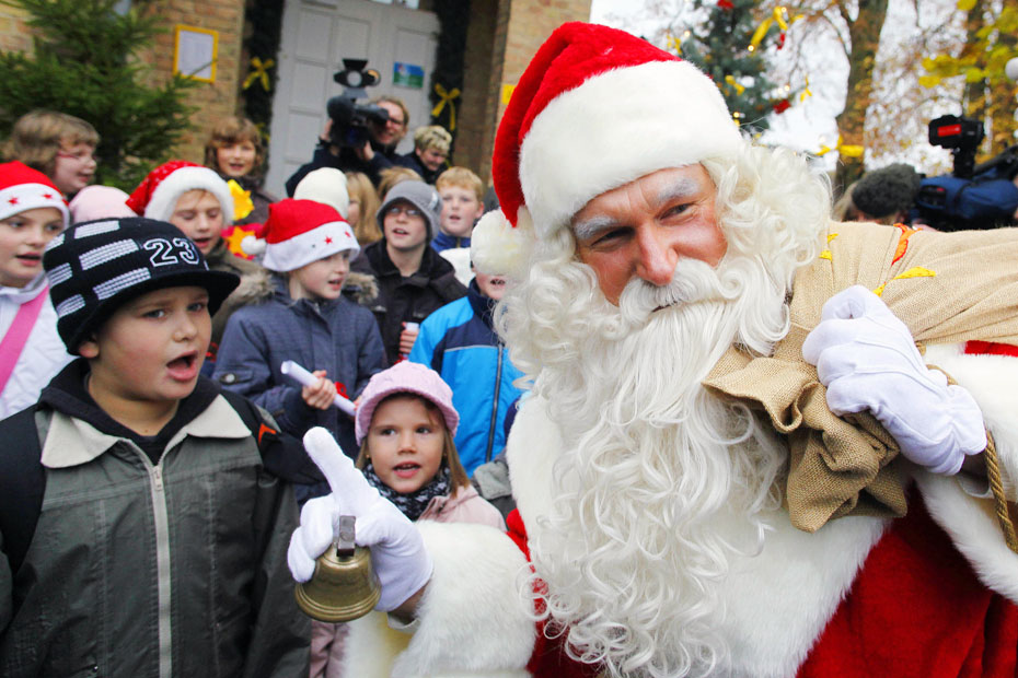 圖為德國(guó)一名男子打扮成圣誕老人在郵局前與孩子們玩耍。