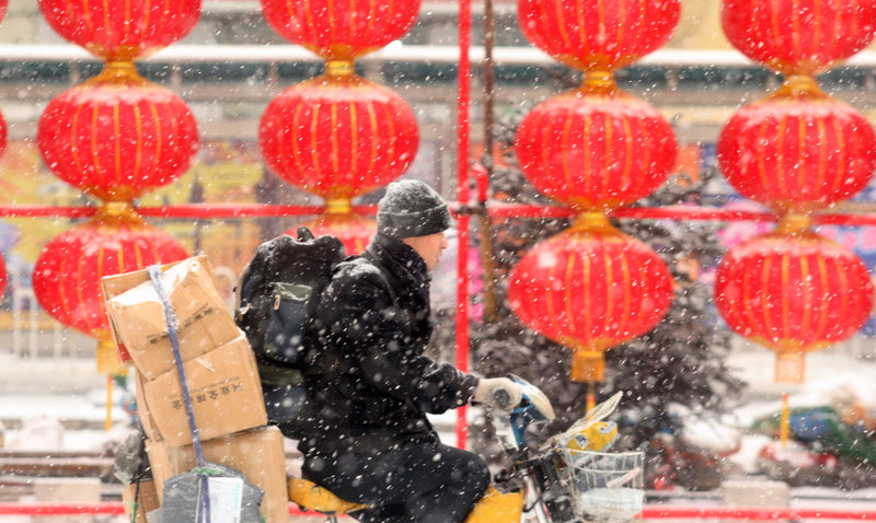 12月25日,受寒潮影響,哈爾濱大雪紛飛。圖為道里區(qū)經(jīng)緯街上,市民們從紅燈籠旁經(jīng)過。蘇強(qiáng)攝