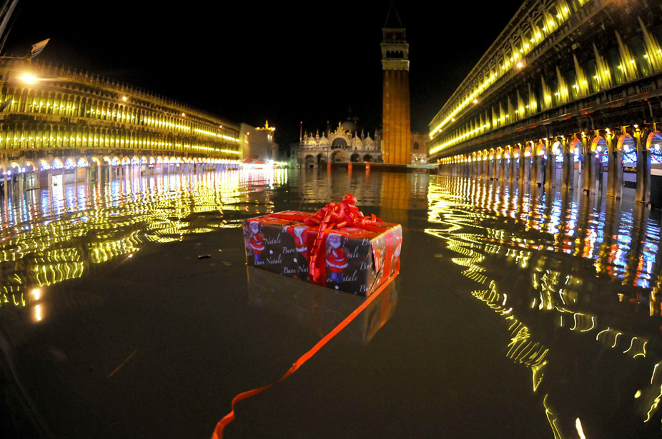 12月25日,意大利水城威尼斯圣馬可廣場(chǎng)被洪水浸泡。自從11月份以來(lái),水城威尼斯受潮汐和一股強(qiáng)烈的熱帶風(fēng)暴影響屢遭洪水“淹沒(méi)”。