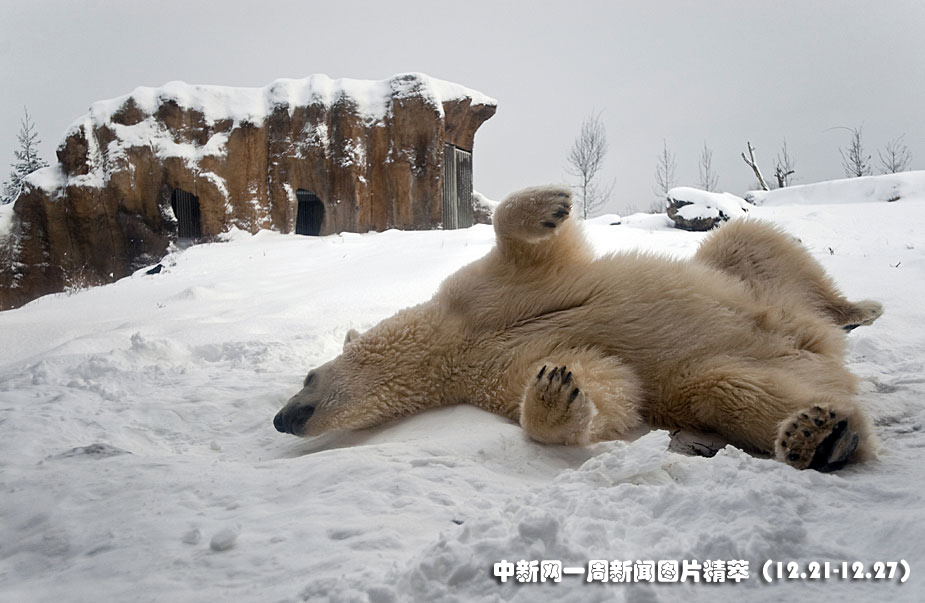 21日(周一),荷蘭鹿特丹動(dòng)物園內(nèi)北極熊正在享受積雪所帶來(lái)的樂(lè)趣。