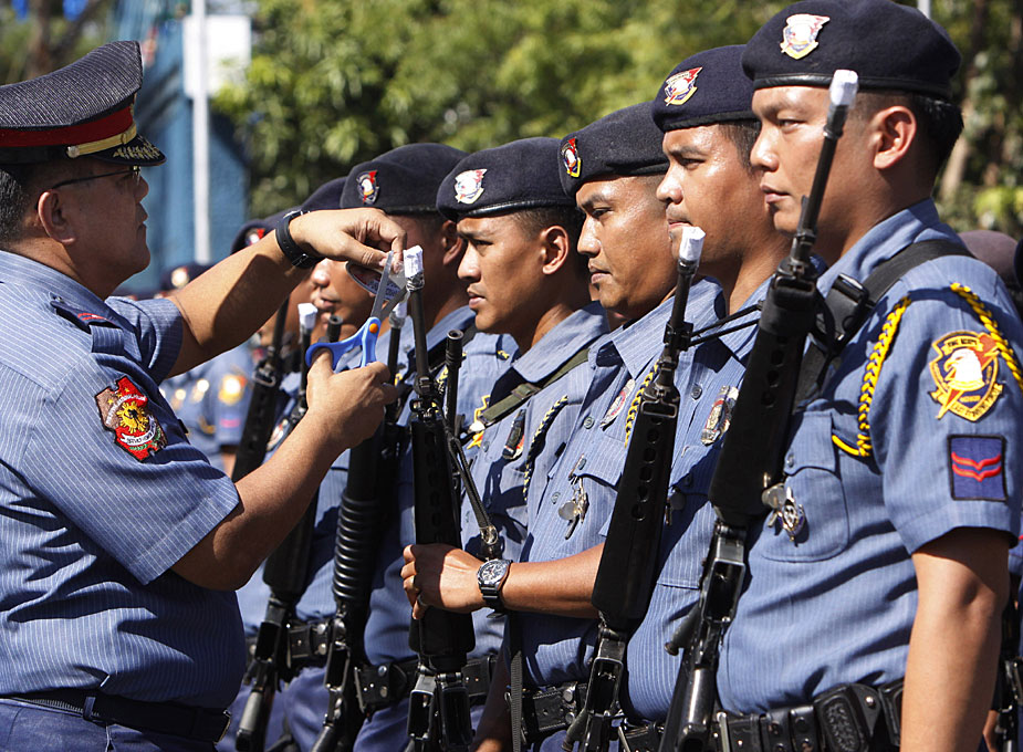 12月29日,菲律賓首都南部的塔吉格市警察部隊(duì)為了防止警務(wù)人員在慶祝新年時(shí)胡亂開槍,下令用膠紙把槍口封起來。圖片來源:中國新聞網(wǎng)