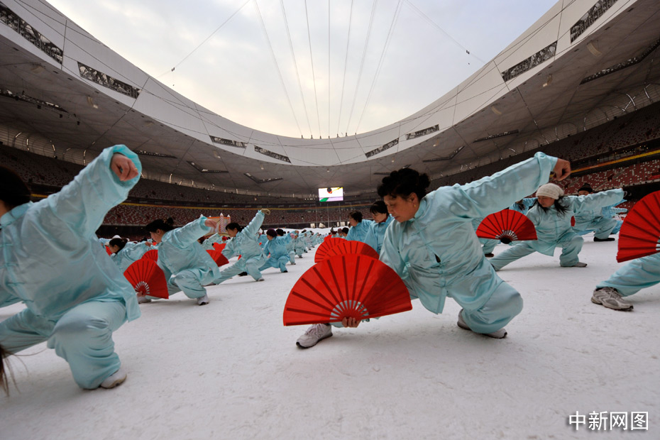 2010年1月1日上午,2010人在被冰雪覆蓋的鳥巢內表演了太極拳、武功扇等民族傳統(tǒng)健身項目。中新網(wǎng)記者 金碩 攝
