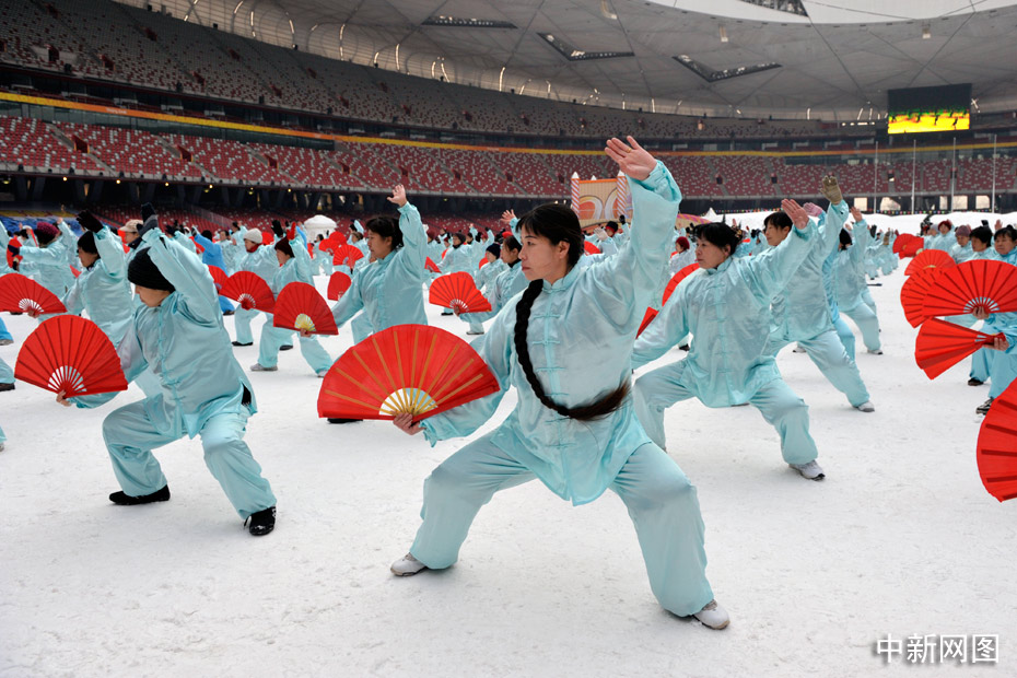 2010年1月1日上午,2010人在被冰雪覆蓋的鳥巢內(nèi)表演了太極拳、武功扇等民族傳統(tǒng)健身項目。中新網(wǎng)記者 金碩 攝